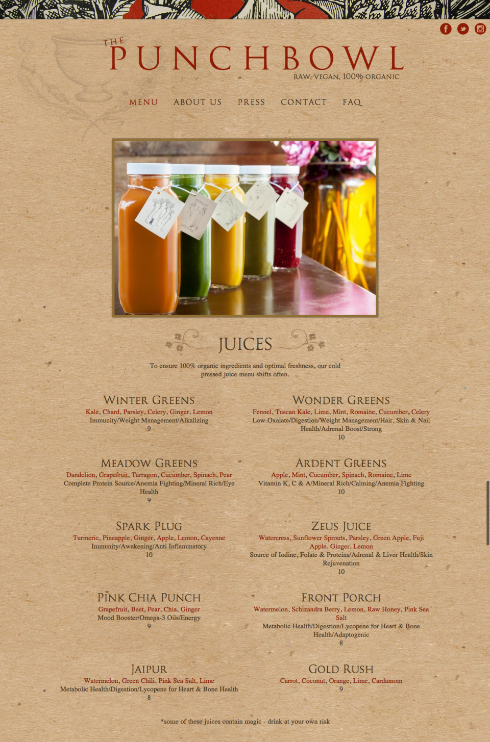 Raw, vegan, 100% organic juices and shakes.